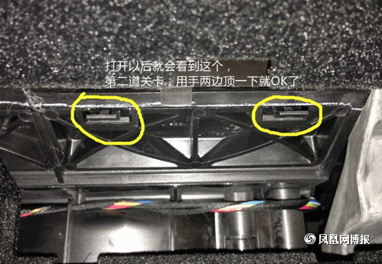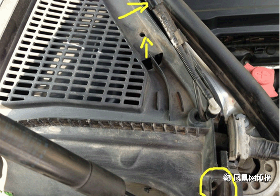 接下来我们再来拆接外部的空调滤芯, 黄色标出的地方就是机关所在,圆圈的部分就只要用手指一捏就可以松掉提起,箭头部分是拔出来后的样子,所以童鞋们不用担心用力一拔就可以了。