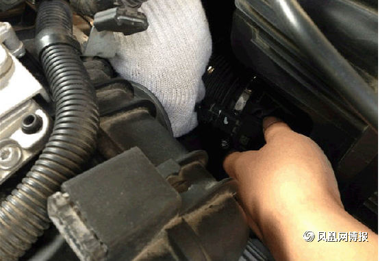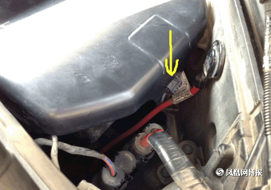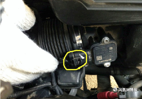 接下来就是要准备拆下空气滤芯了,第一次拆的童鞋要注意了,图中标出来的就是连接空气滤芯的接口,不要像我这样拽了半天也没拔出来,原来这上面有个小机关,有个凸起的小开关左手往下按的同时右手往后面拉,它就出来了。(另外,告诉大家,在经过行驶后停车的拆装的童鞋要等车子发动机冷却后再动手,不让带了手套,你还是会觉得旁边的发动机很烫,会不小心被烫到。)